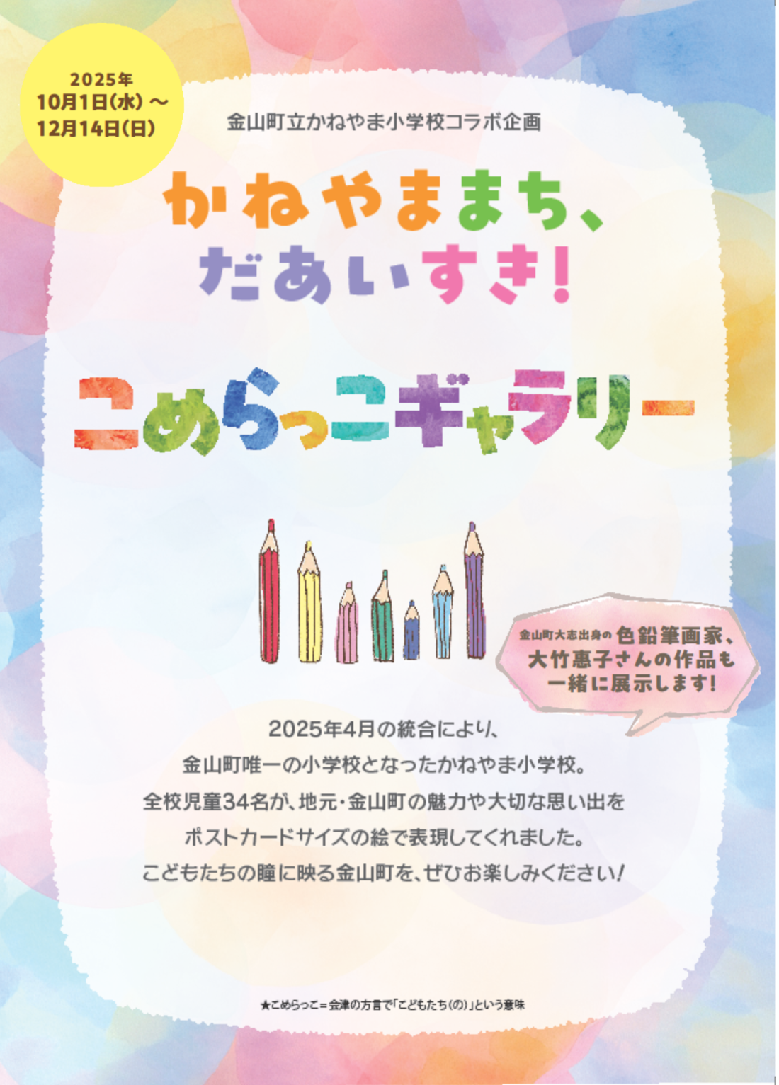 【かねやま小学校コラボ企画】2025年12月14日(日)まで 絵で見る、こどもたちの瞳に映る金山。2025年10月1日(水曜日)から2025年12月14日(日曜日)まで、金山町立かねやま小学校コラボ企画「かねやままち、だあいすき!こめらっこギャラリー」を開催しております。