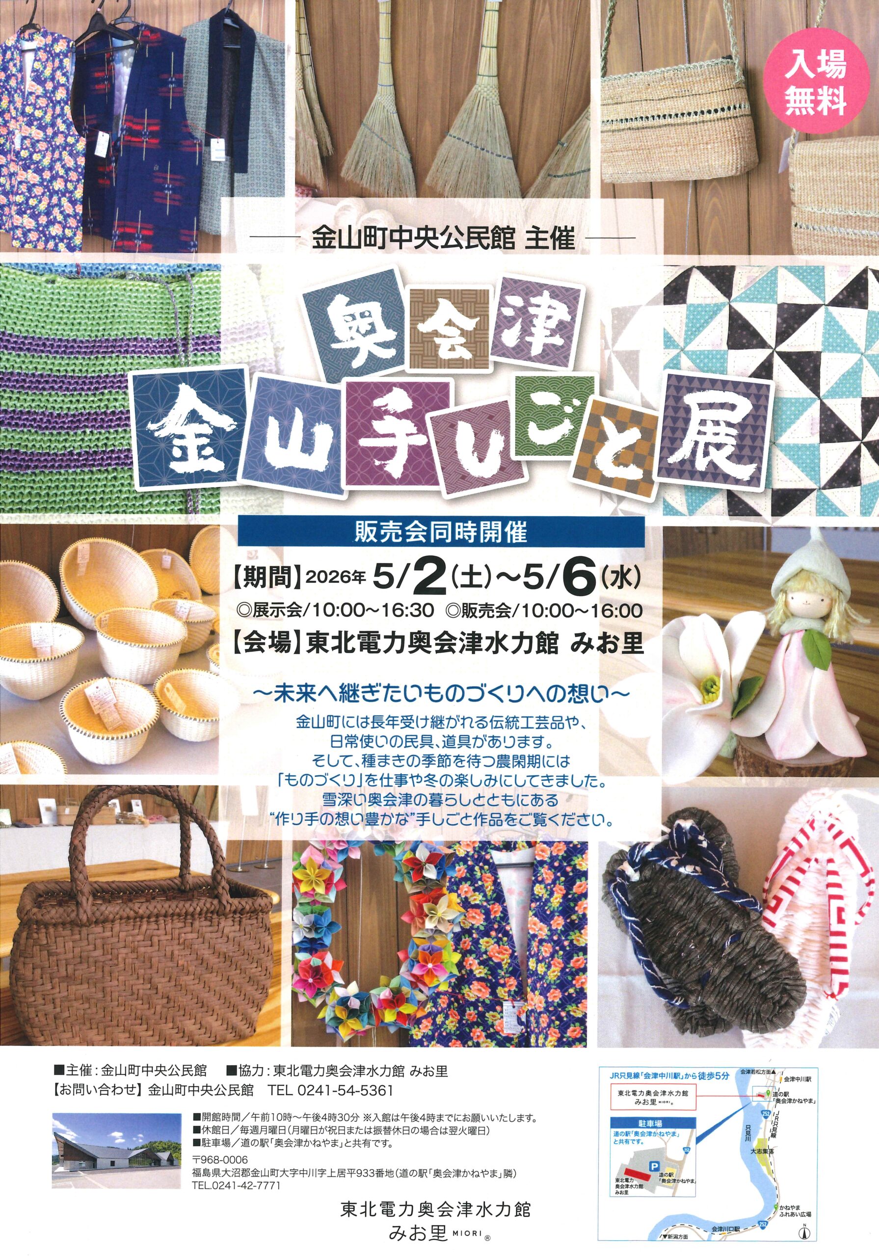 【GW5/2~6の5日間】奥会津金山町の自然素材を活かした「伝統工芸の展示・販売会」開催!当館みお里にて、ゴールデンウィーク期間中の5月2日(土曜日)から6日(水曜日)まで5日間、金山町中央公民館主催「奥会津金山手しごと展」(展示・販売会)が開催されます。